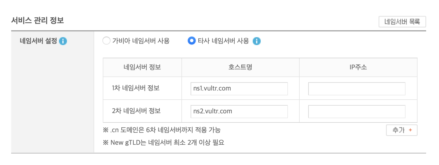 가비아에서 도메인을 구입할 때 vultr에 연결하기 위해 네임서버를 ns1.vultr.com, ns2.vultr.com으로 등록한다. - [1]